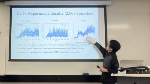 【AI専攻の学生さんのコメント】 AIの「強化学習(Reinforcement Learning)」の授業が一番楽しかったですね。今AIがブームになっていますが、AIを作るために人類がどういう風に苦労し、改善してきたかという歴史を学びながら、実際にどう動いているかを学んでいくのがとても面白かったです。「ここがダメだからもっと改善して」という過去の積み重ねを知ると、今のテクノロジーがいかにすごいか改めて分かります。