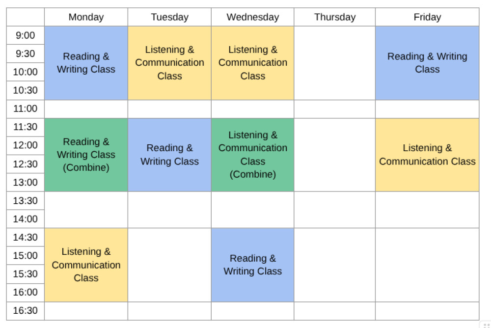 基本的にはReading & Writing、Listening & Communicationの授業が週4コマずつありました。木曜日は授業はなくお休みでしたが、休めるかというとそうでもなく(苦笑)、自習室に篭って課題を進めていることが多かったです。ちなみにクラスはIELTSのスコア0.5単位で区切られていて、週に計2コマあるCombine Classのみ、他のクラスの生徒と合同で授業を受けていました。