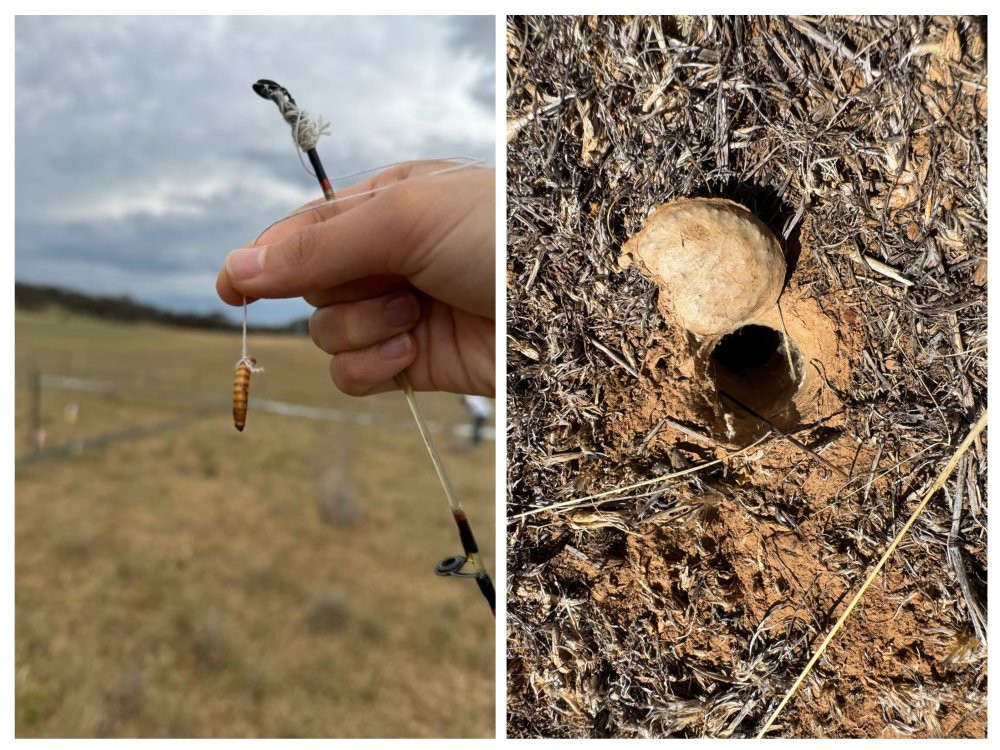 (2)餌をつけた「釣り竿」を使い、巣穴の中にいるトカゲをそっとおびき出します。