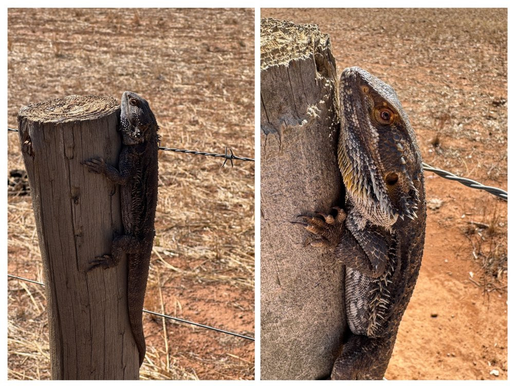 フィールドトリップ中、車で草原を移動していると、フェンスの上に巨大な野生のトカゲが悠然と佇んでいたんです。