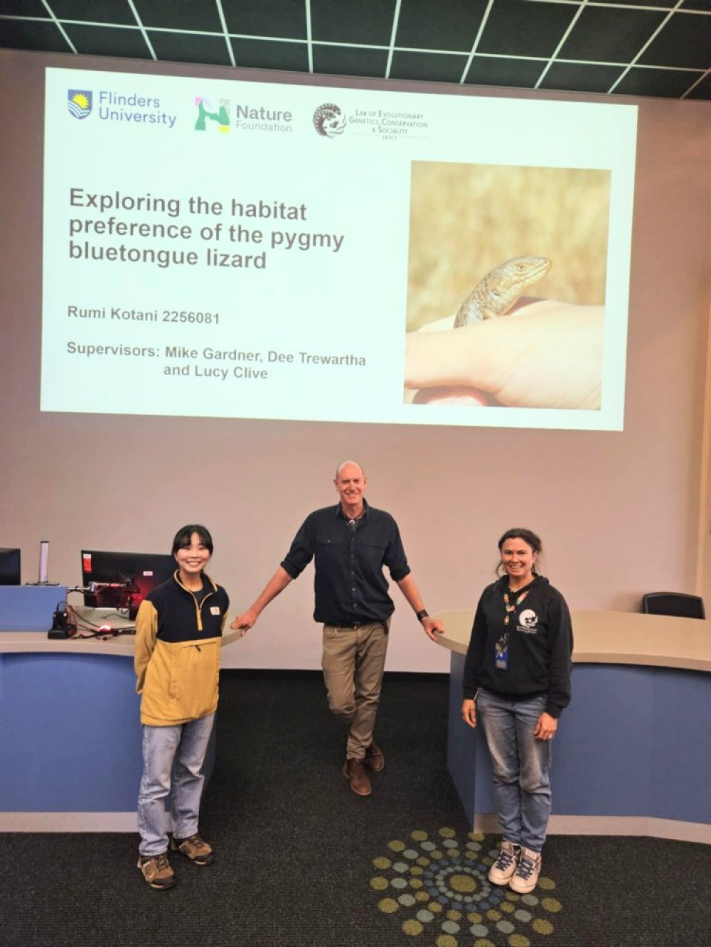 私の研究は「絶滅危惧種 ピグミーブルータングリザード(Pygmy Blue-tongue Lizard)の生態地域の特定」というものです。